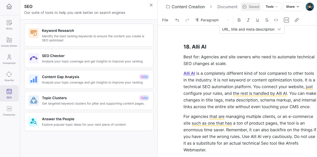 SEO.ai is a new entrant in the market, but it has gained attention quickly. It combines a top-notch AI writing engine with deep SEO data, allowing you to do things like research, write, and optimize with ease in a single platform. The interface is pretty straightforward, and the output quality is above average if you analyze the AI-generated content.