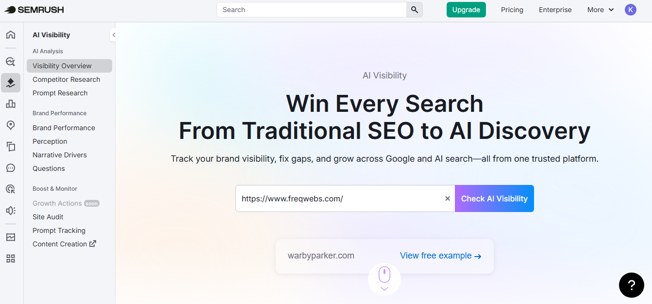 Semrush is the gold standard for digital marketers and businesses around the world. What makes Semrush stand out is its AI visibility toolkit, which tracks more than 100 million prompts across ChatGPT, Google AI mode, Perplexity, and AI overviews in six regions. No other tool in the market is capable of this level of AI search monitoring at scale.