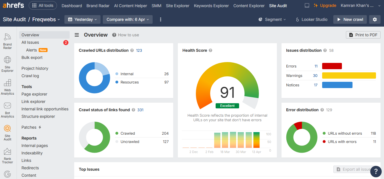 In 2026, Ahrefs still tops the ranking if we are talking about SEO tools in the market. Ahrefs is the best choice for data pursuits that want the most reliable link index. The platform also has an enormous keyword database; its backlink data is what you can rely on, and the site audit tool, which you can get access to through Ahrefs Webmaster tools, is truly a game-changer; it helps you to fix all kinds of technical issues that other tools miss.